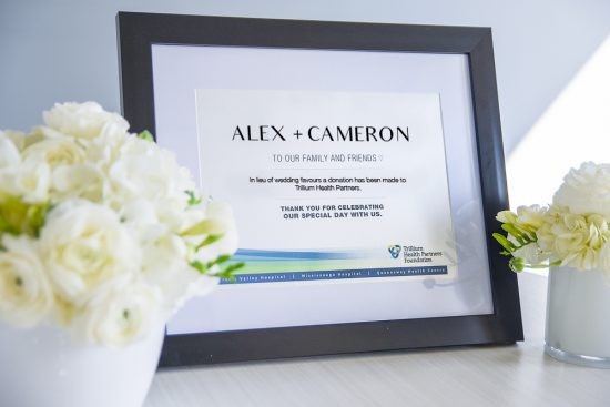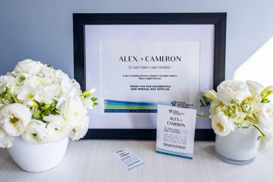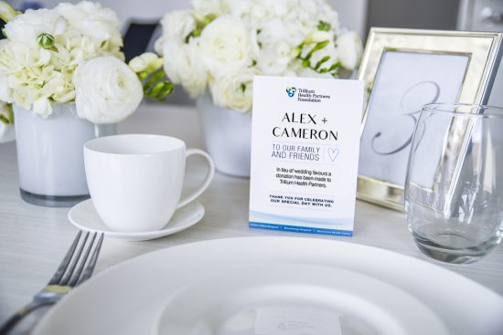 To inform your guests of your meaningful gift to Trillium Health Partners in lieu of favours, you can select up to two recognition pieces that will be customized for your wedding. A minimum donation of $150 is required.